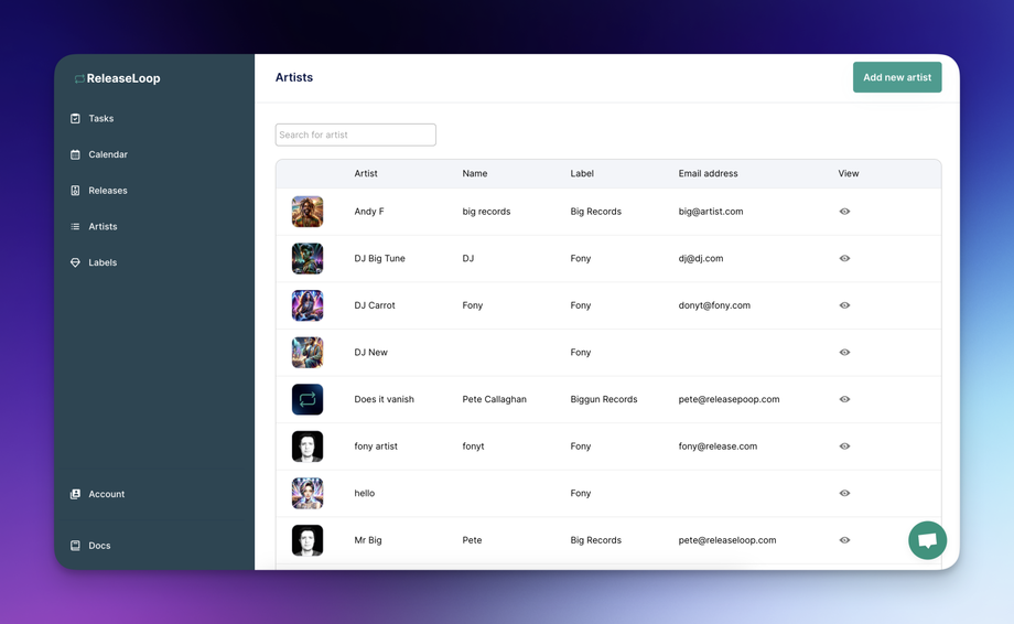 When you add a new release and assign it to an artist, you'll also see the release on their profile page. You can upload a contract here if needed. Pressing the eye icon will take you to the release page.