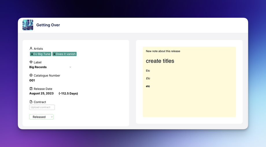 The release page will open. Here, you can add metadata, upload contracts, write notes, plan tracks, and add tasks.