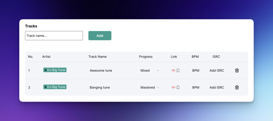 You can add track names/titles by typing them into the input and pressing add. ReleaseLoop will add them to the table from here; you can assign artists (you'll see a dropdown when clicking), track titles, progress (WIP, mixed, mastered, complete), links (add a Dropbox, SoundCloud, etc.), BPM, and ISRC.