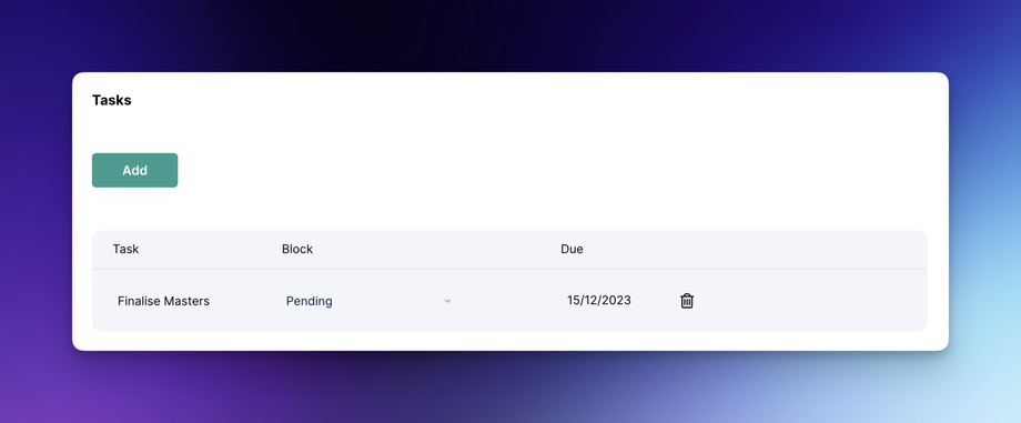 Adding a task here will assign it to the current release and display it in the table. If you have multiple task blocks, you can change them in this view, too. You can also change the due date as well as delete the task. In this table, you will only see tasks assigned to the release you're viewing.